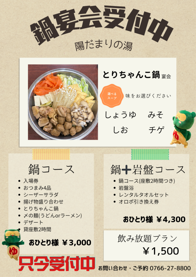 このたび、宴会の鍋・岩盤コースの料金をお安く利用いただけます。鍋コースに岩盤利用、そしてオロポも付いて4300円にてご利用いただけます。飲み放題は、お一人様2時間1500円です。新年会や、お友達とのお食事会などにご利用いかがでしょうか?初めての岩盤利用にもおすすめです。一日ゆっくり岩盤と宴会、そしてお風呂と過ごしていただけます。